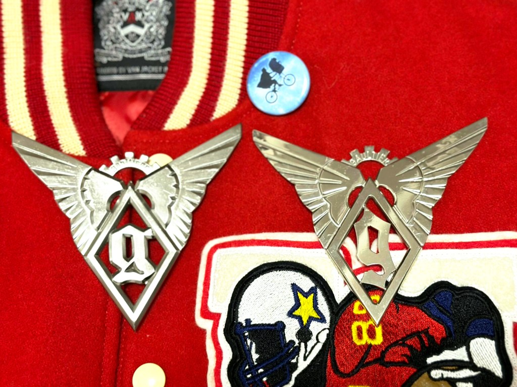 流通しているバッジは、MJと同型のものは確認できないため、極少数存在するのか、もしくは見栄えが良い方のロゴをピンバッジに改造して贈った説を想像しています。