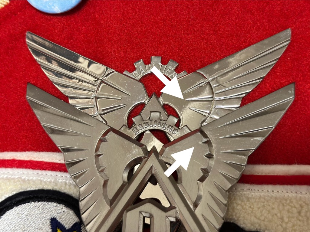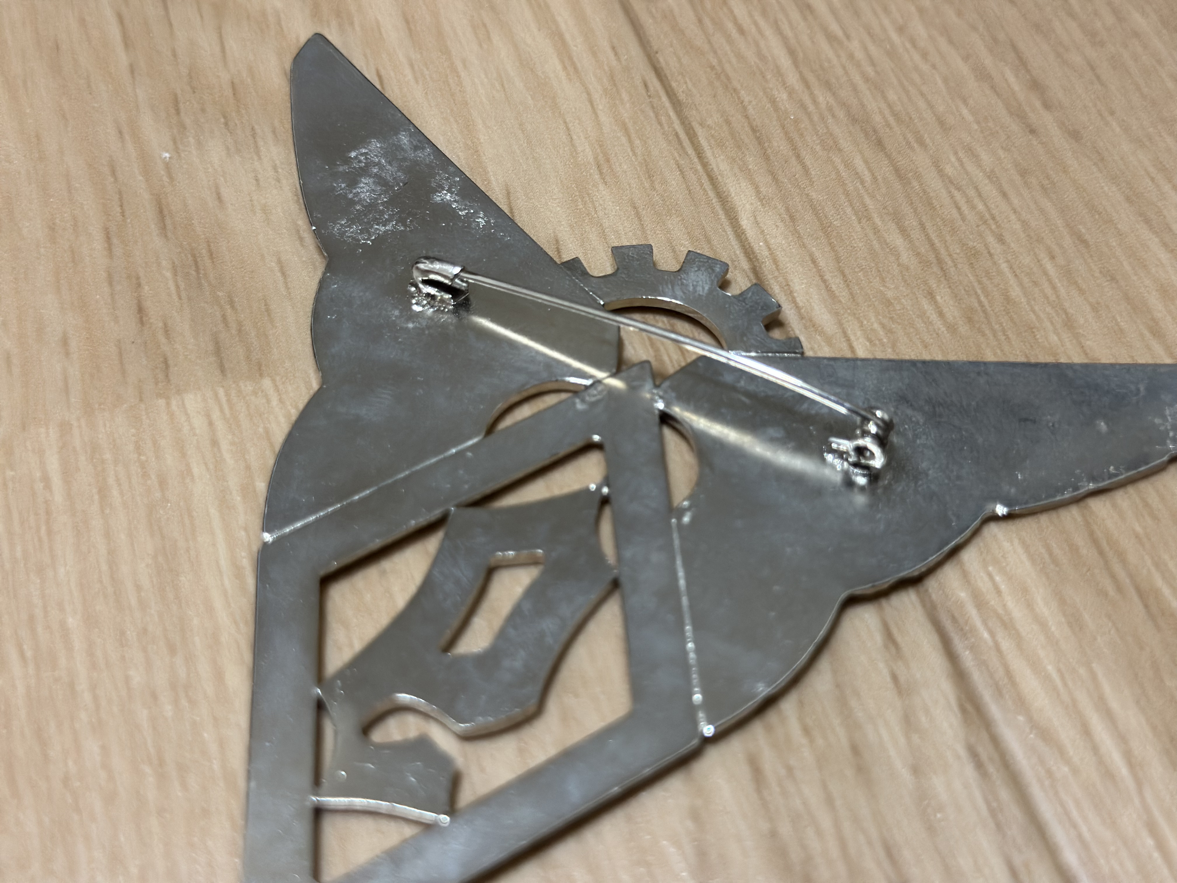 裏側は、こんな感じです。羽とロゴの3点がカナメ(ピン?)で打ち込んでありました。